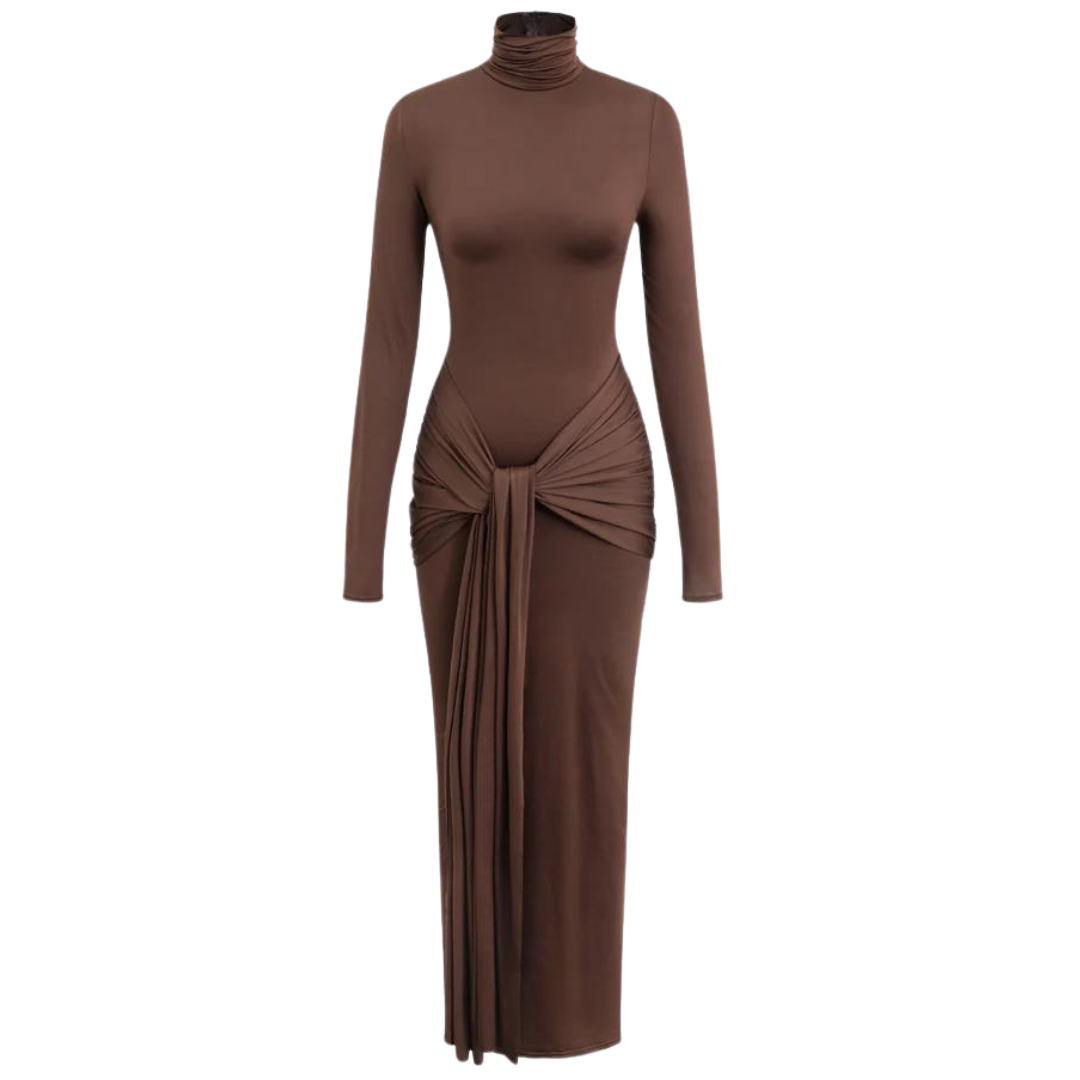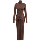 Das Bodycon Kleid hat einen hohen Kragen, der dem Kleid einen zeitlosen Look verleiht. Der elastische Stoff schmiegt sich perfekt Ihrem Körper an und bietet gleichzeitig ein angenehmes Tragegefühl. Das besondere Highlight ist das Knotendetail vorne.