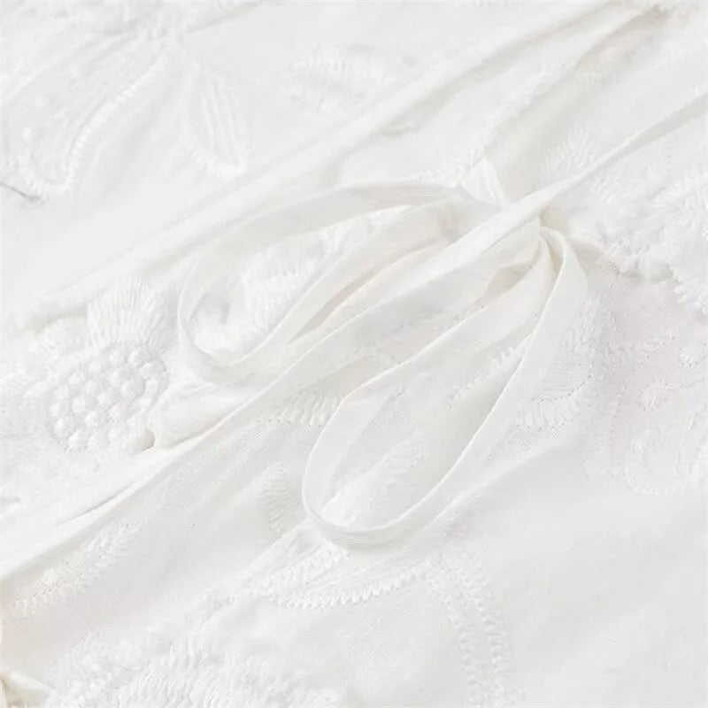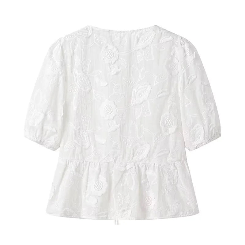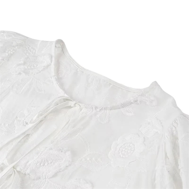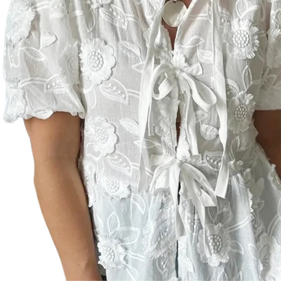- Stickerei: Die kunstvolle Blumenstickerei auf der Vorderseite und den Ärmeln verleiht der Bluse eine zarte, feminine Note. Die detaillierte Stickarbeit macht diese Bluse zu einem echten Hingucker.